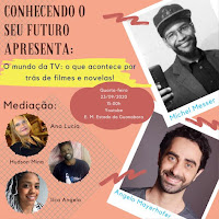 O bate papo foi muito legal, onde exploramos o universo da TV e da arte como um todo. Angelo falou sobre seu trabalho e expectativas com a arte, e nos contou de trabalhos que ele produziu com alunos da rede municipal, onde até foram indicados a premiações!
